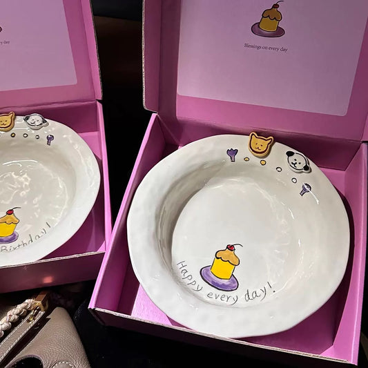 Handmade Cartoon Ceramic Plate with Gift Box โ Happy Birthday Theme