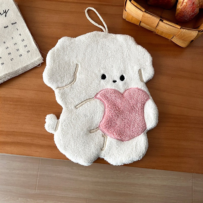 Add a sweet touch to your home with this Heart Puppy hand towel. Designed in the shape of a fluffy white puppy hugging a soft pink heart, it’s both adorable and practical. Made with plush coral fleece, it’s ultra-absorbent and gentle on the skin. The handy loop makes it easy to hang in the kitchen, bathroom, or anywhere you need a little extra cuteness.