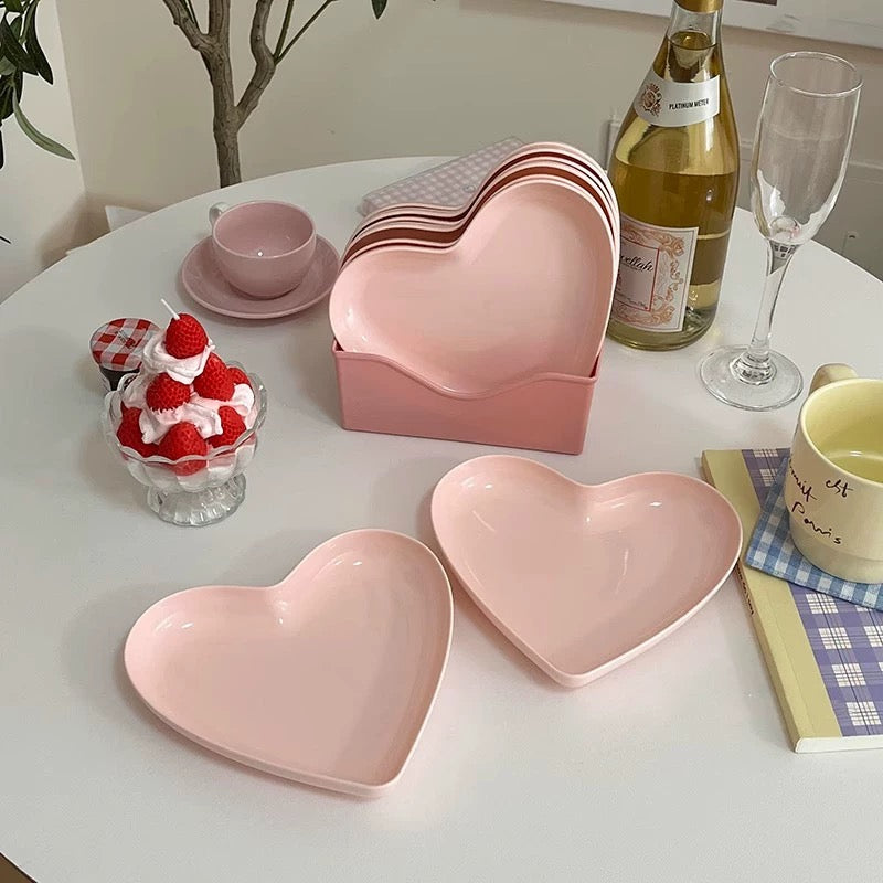 Pink Heart-Shaped Serving Dish & Bone Plate Set (8 Pieces with Base)