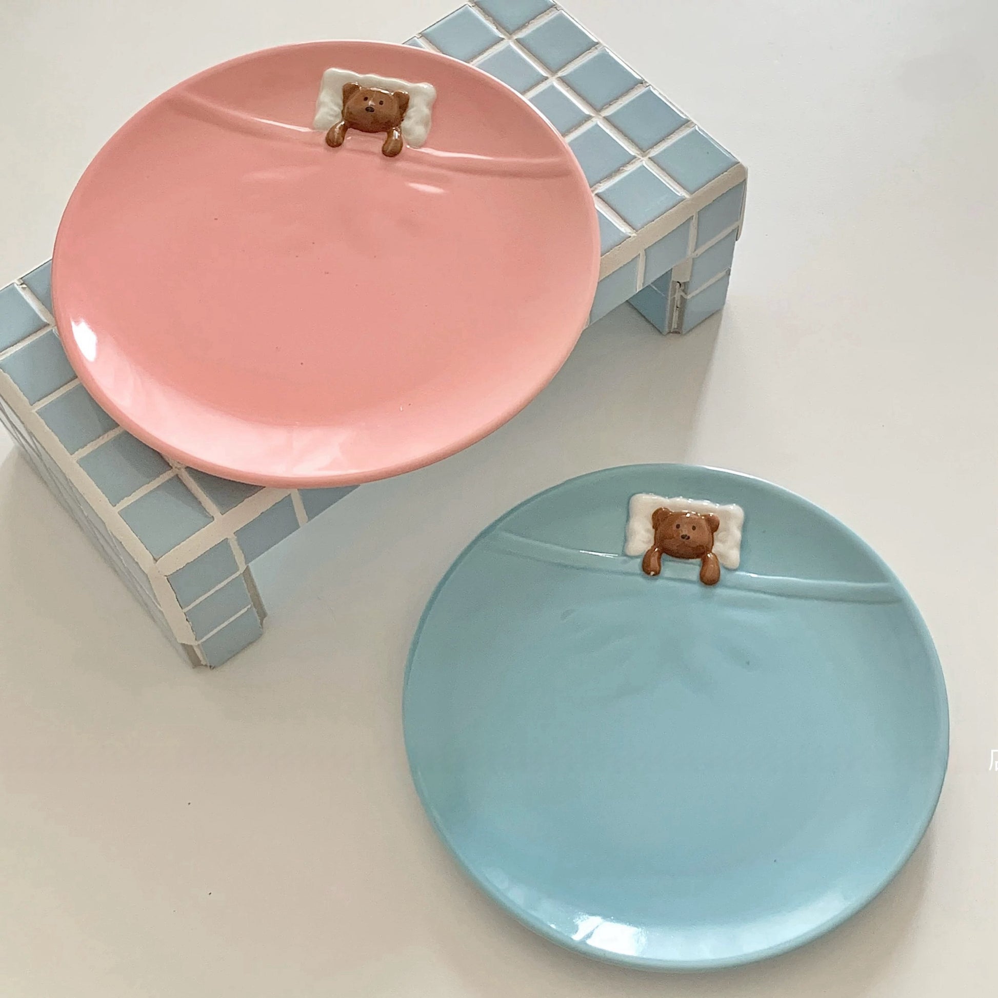The Bear in Blanket Ceramic Plate features an adorable 3D design of a bear tucked under a blanket, radiating warmth and cuteness. Available in soft pink and sky blue, it brings a cozy and cheerful vibe to any dining or display setting.