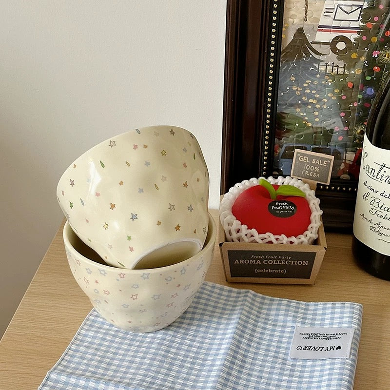 The Butter Yellow Star Ceramic Bowl Set features a soft butter-yellow base decorated with delicate star and floral motifs. The gently rounded shape and subtle hand-formed texture give each bowl a relaxed, cozy feel, making it perfect for everyday dining and casual home use.