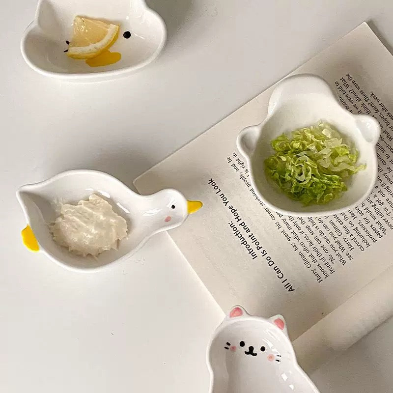 These adorable dipping dishes come in three charming designs: a cuddly bear, a playful cat, and a cute little duck. Featuring vivid shapes and soft pastel tones, they’re perfect for sauces, snacks, or decorative plating. With their compact size and practical design, these dishes are ideal for daily meals, dessert spreads, or child-friendly table settings. Sold individually, you can mix and match to suit your personal style.