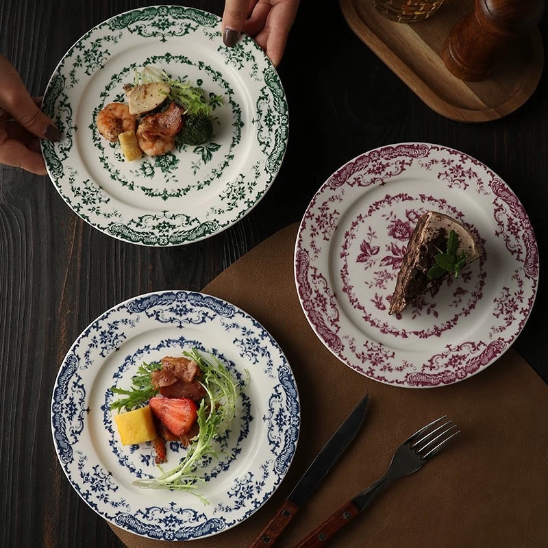 Crafted from high-temperature ceramic, this plate features a timeless vintage floral design, adding an elegant touch to your dining table. Available in three colors: blue, red, and green, it complements various tableware styles. Perfect for family gatherings or enjoying a solo afternoon tea, this plate offers both aesthetic and functional benefits.