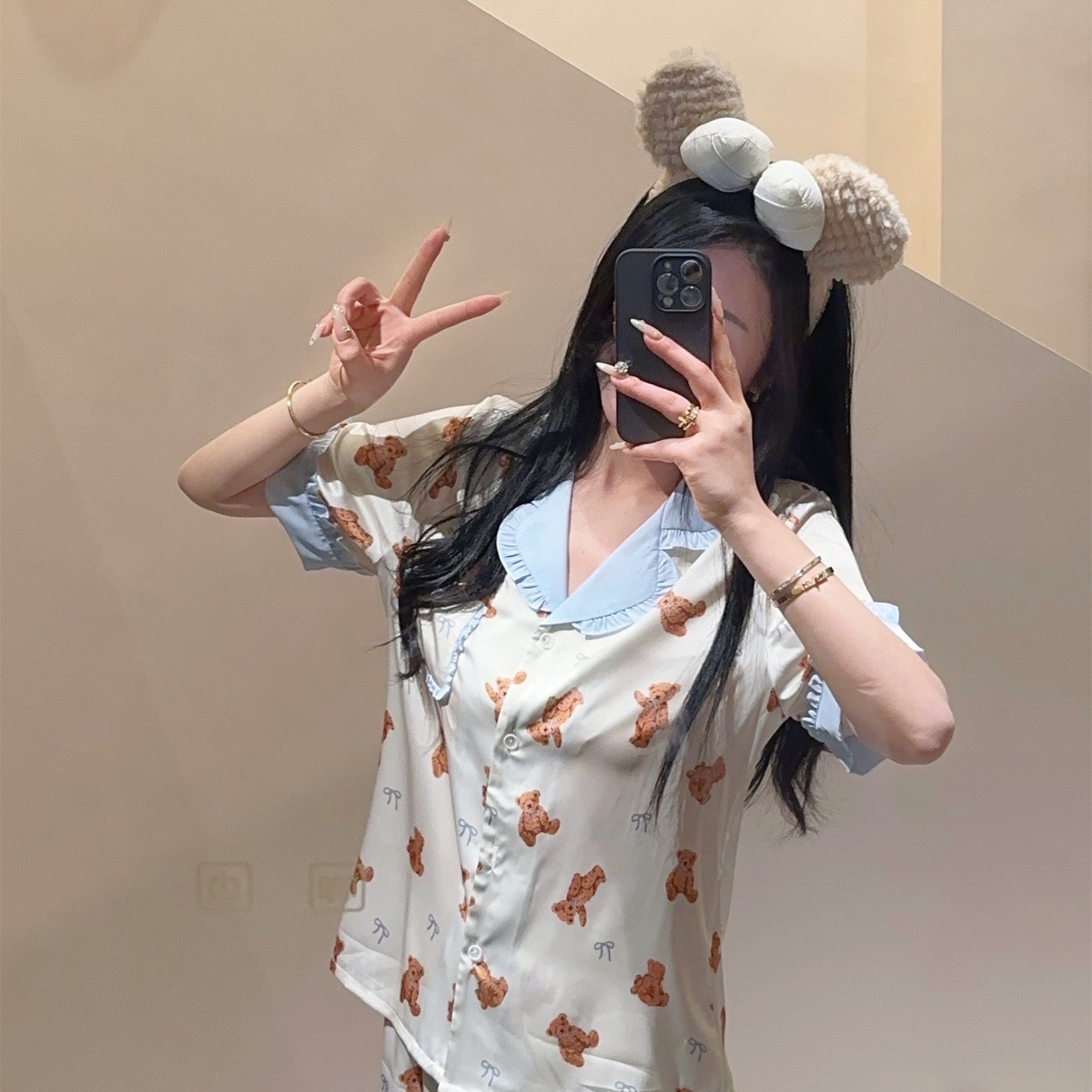 With this cute teddy bear silk pajama set, you can stay stylish and comfortable at home while embracing a cozy and charming look!