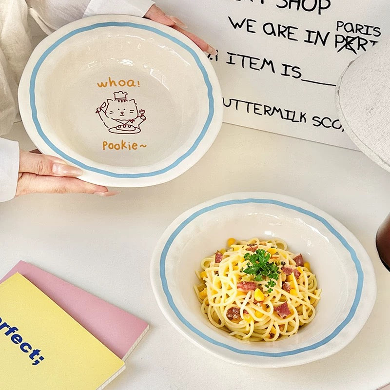 The Hand-Drawn Cat & Dog Blue Line Ceramic Plate features playful cat and dog illustrations paired with a soft cream base and hand-painted blue rim lines. The relaxed, slightly irregular design brings a warm, handmade feel while remaining simple and versatile for everyday use.