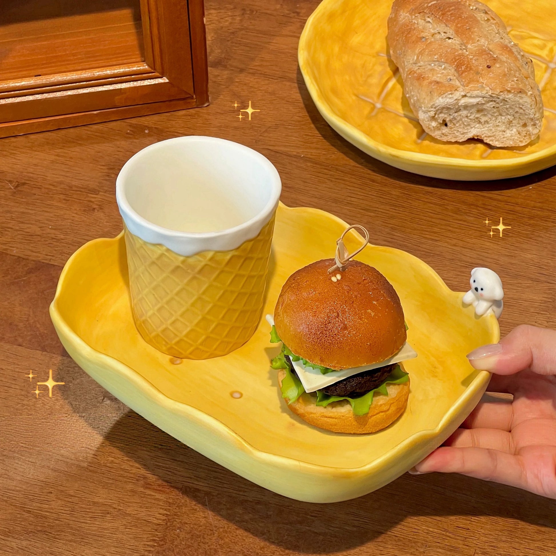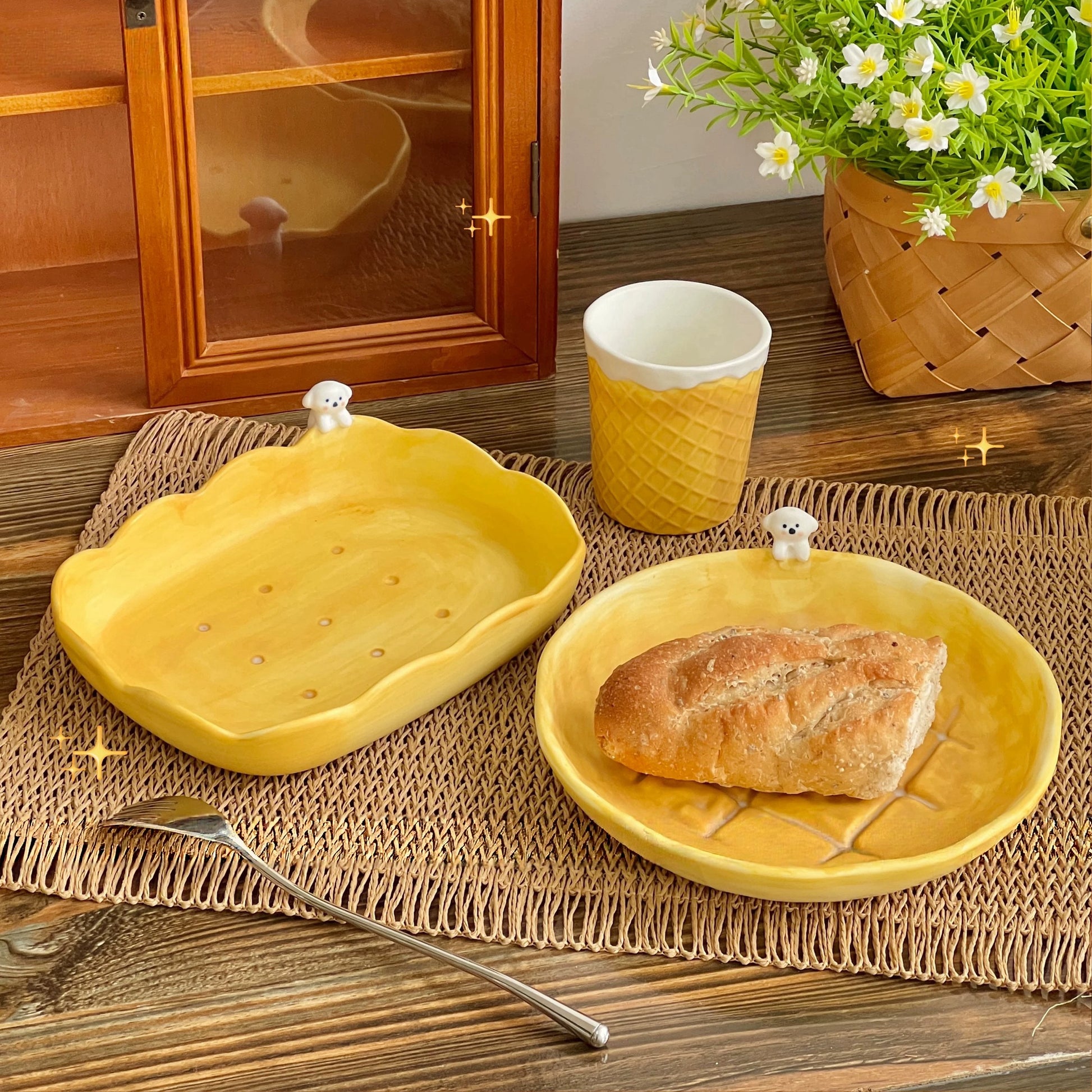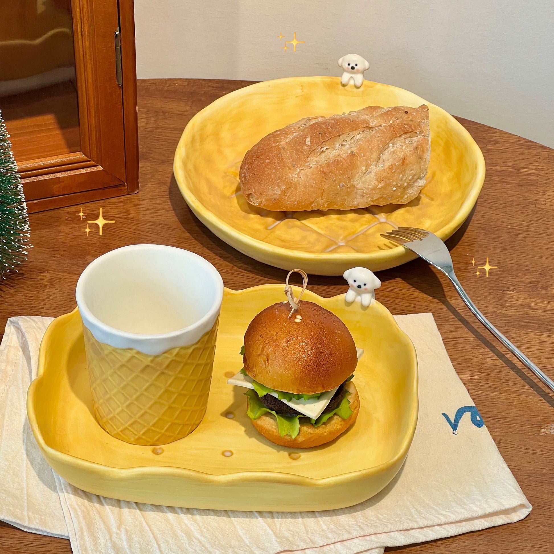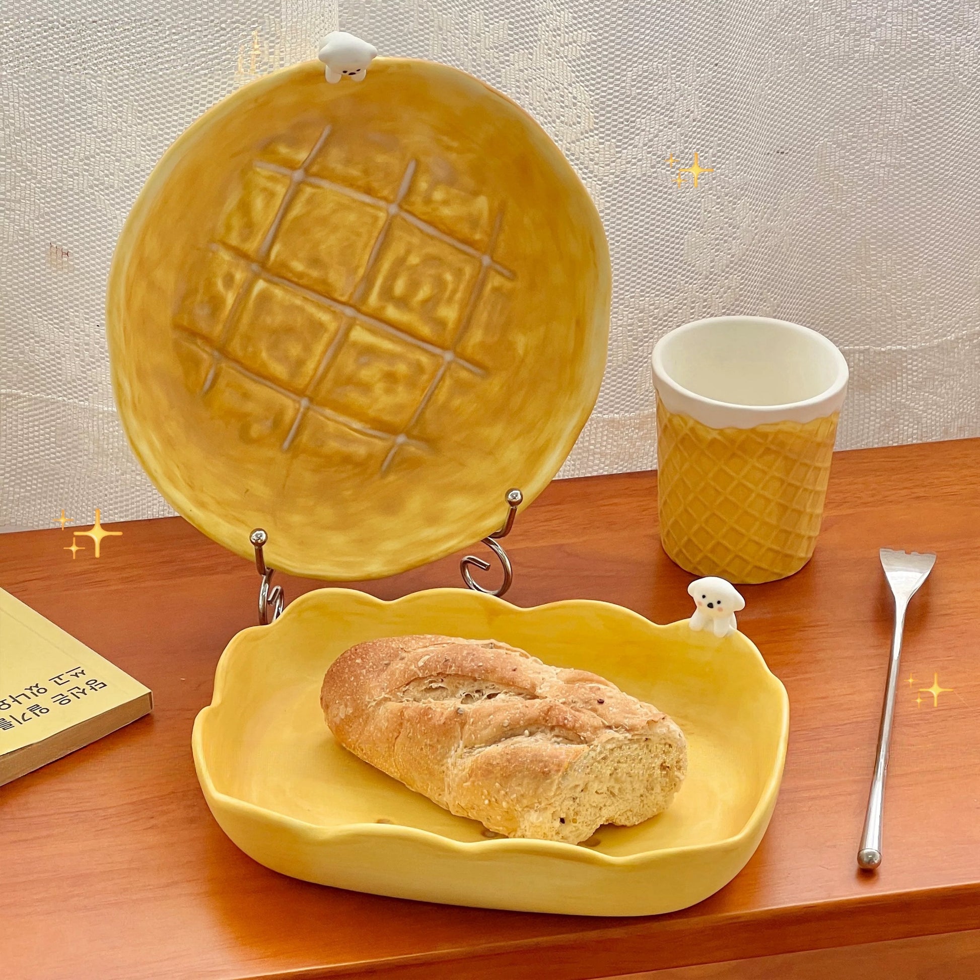 The Pineapple Bun Puppy Ceramic Collection draws inspiration from the iconic pineapple bun texture, paired with adorable puppy accents. Finished in a warm yellow glaze with subtle brushstroke variations, each piece feels cozy, playful, and full of character—perfect for everyday meals, breakfast moments, or as charming tabletop décor.