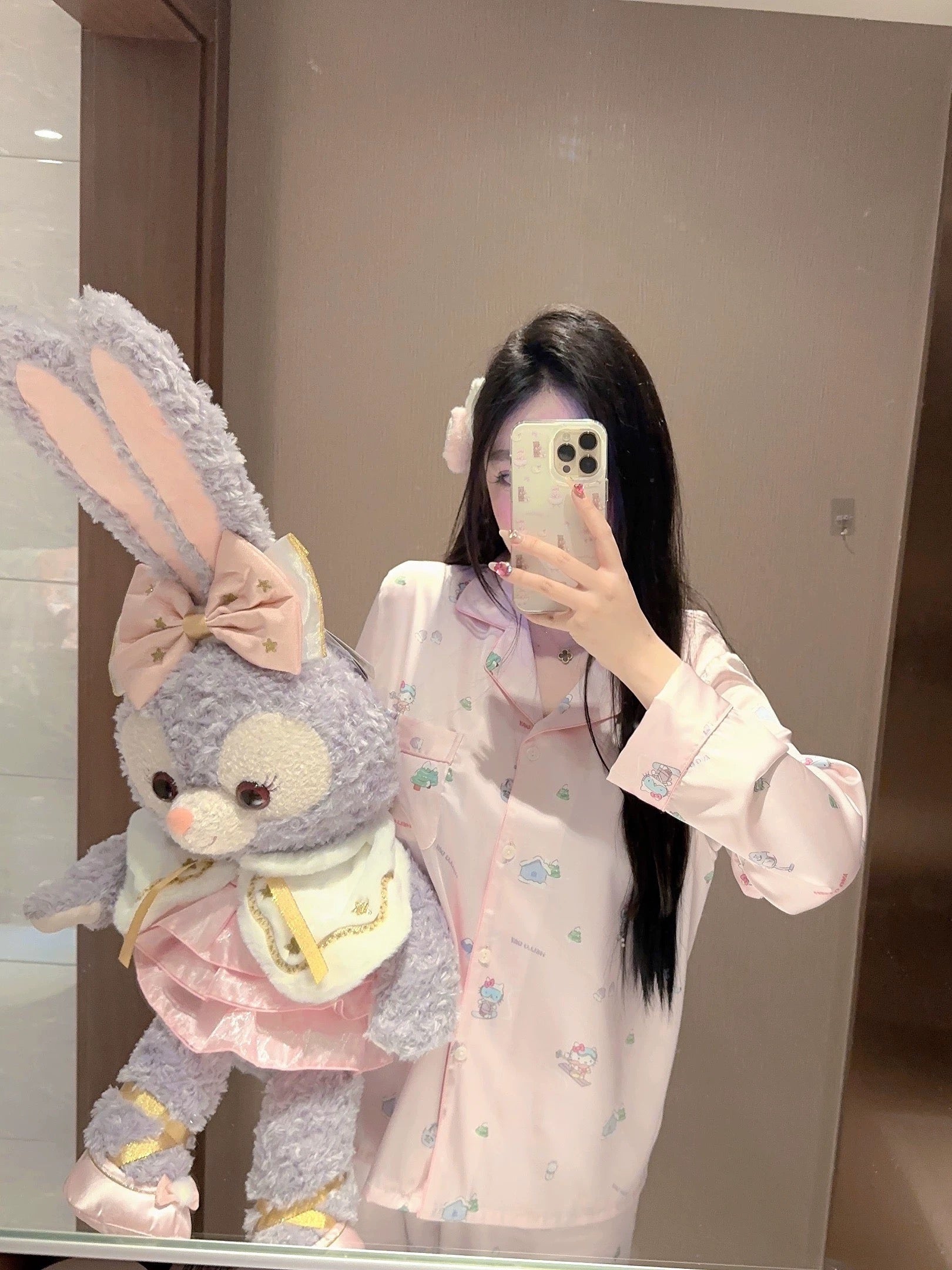 This Hello Kitty pink rhinestone long-sleeve pajama set is crafted from high-quality silk fabric, offering a smooth and luxurious feel that keeps you cool and comfortable. The pink design paired with the iconic Hello Kitty character adds a cute and stylish touch, while the rhinestone details elevate the set's elegance and sophistication. The long-sleeve and long pants design make it perfect for cooler seasons or air-conditioned rooms, ensuring warmth and comfort during home lounging.